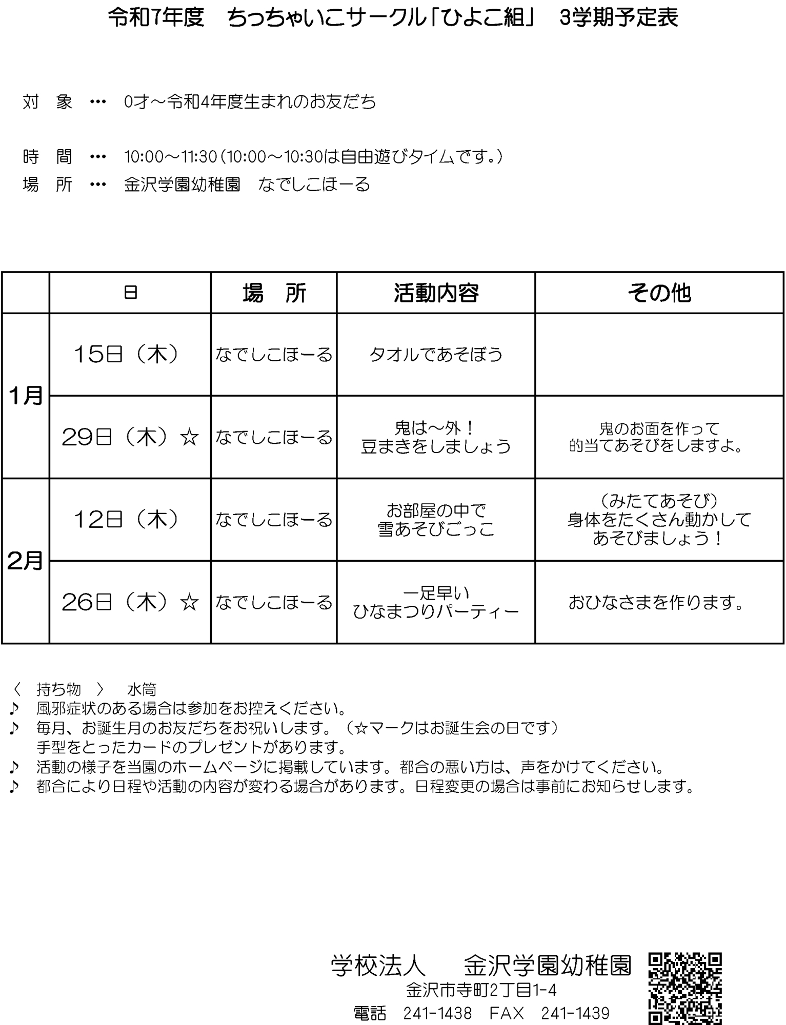 金沢市内にある幼稚園。「つよいこ」「よいこ」「げんきなこ」をもっとうに、毎日、笑顔いっぱいに過ごしています。