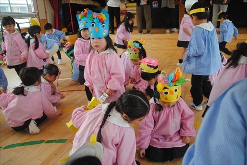みんなが作ったお面をかぶってホールで歌を歌ったり豆まきをしました。途中山の方から怖~い赤鬼と青鬼がやってきて泣いちゃった子もいましたが、みんなで力を合わせてカラーボールで退治しました!!