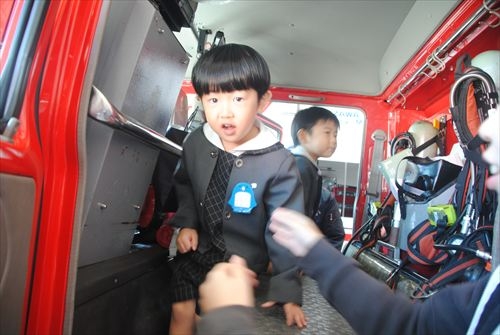 年少さん、今日は中央消防署の見学に行って来ました。救急車、消防車に実際に乗せてもらったり、消防服を着て写真を撮ったり楽しく見学させてもらいました!