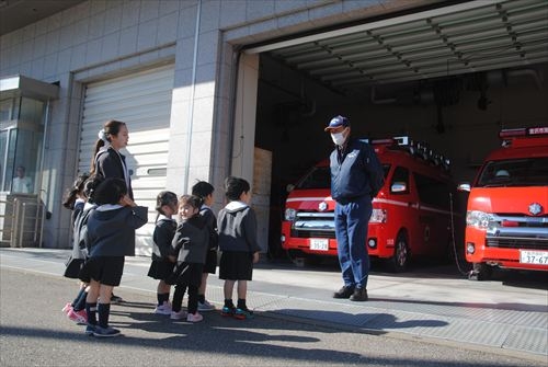 年少さん、楽しみにしていた消防署見学に泉野消防署へ行って来ました!救急車に乗せてもらったり、消防車の説明、消火器の使い方、最後は消防服を着たりと、いろんなことを教えてもらい、盛りだくさんの見学となりました。